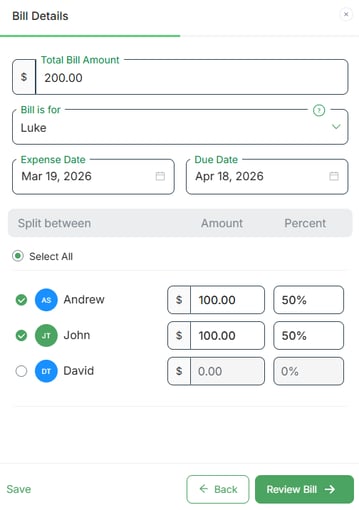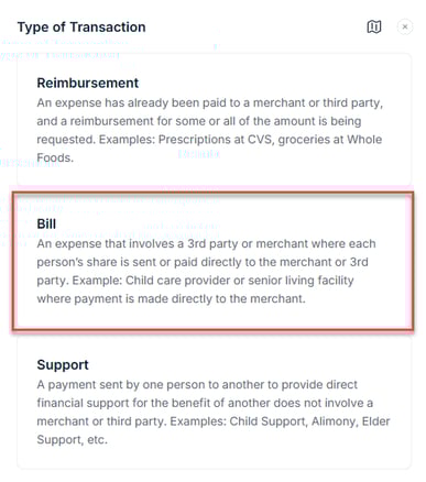 A bill in SupportPay is an expense that involves a third-party or merchant, where each person’s share is paid directly to that merchant or third party. To add a bill expense, follow the instructions below: