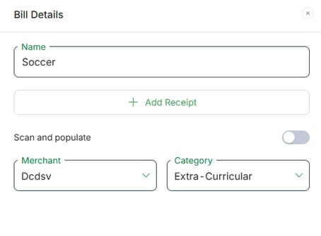 3. Enter the bill details (name, merchant, category). Here, you can also upload a receipt if you have one for the expense you're creating by clicking on the + Add Receipt button.