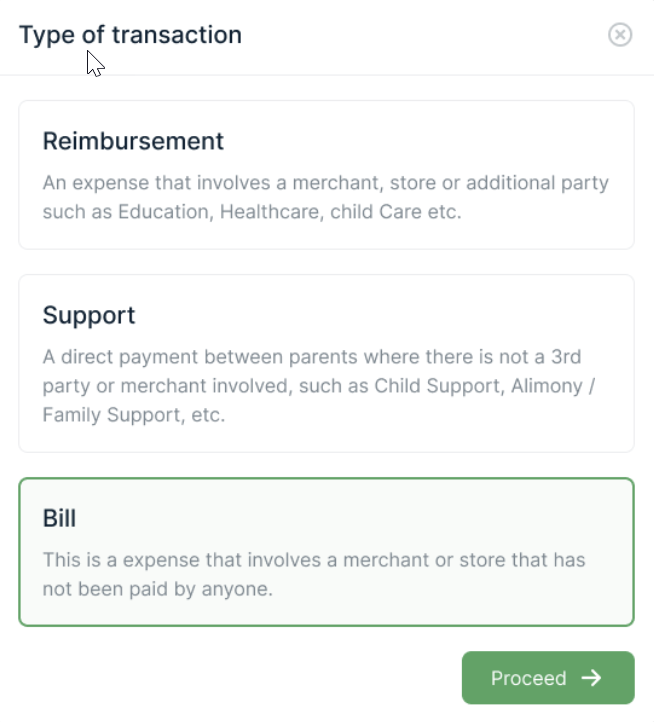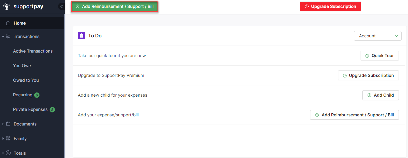 1. Click on the green Add Reimbursement/Support/Bill button at the top of the page.