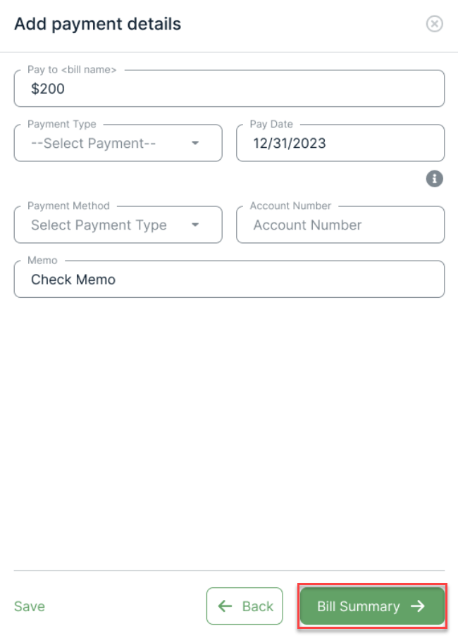 5. Add the payment details for the bill. Once ready, click on Bill Summary.