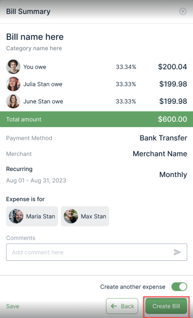 6. Take a moment to review your bill entry and include any necessary comments. Upon completion, click Create Bill.