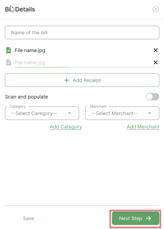 3. Enter the bill name, category and merchant. Here you can also upload a receipt if you have one. Once ready, click on Next Step.