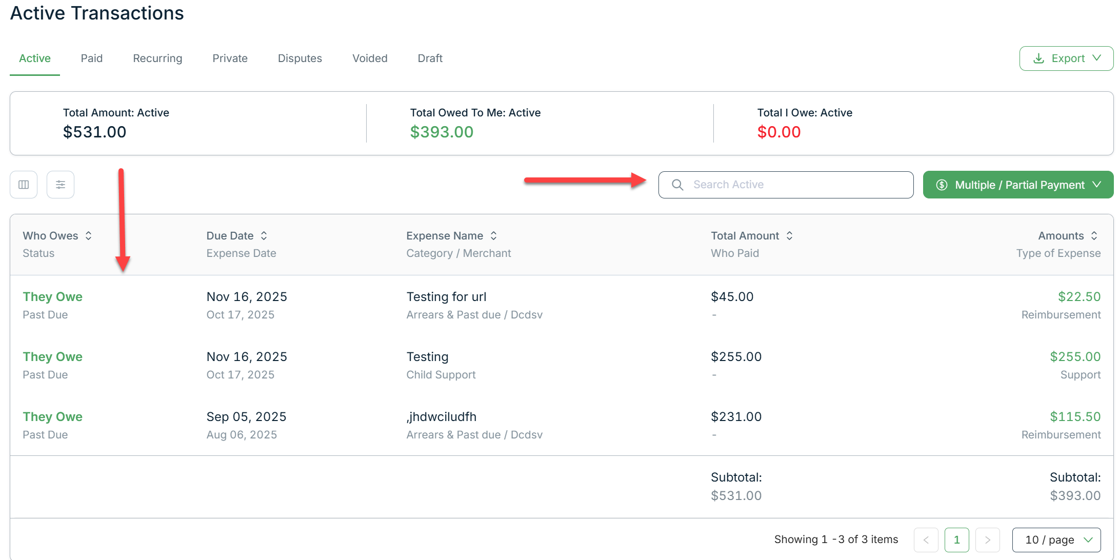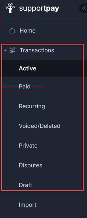 1. Go to Transactions on the left-hand side menu and select the section in which you will locate your expense. For this example, we're selecting Active.