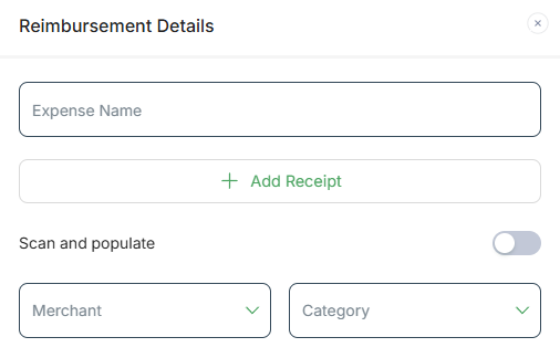 3. Enter the reimbursement details (name, merchant, category). Here, you can also upload a receipt if you have one for the expense you're creating by clicking on the + Add Receipt button.