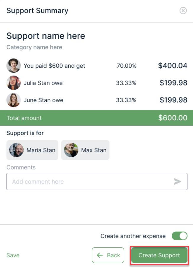 3. Provide pertinent details about the support, such as the name, category, recipient, and more. This step also allows you to distribute the amount among multiple family members. This is also the step where you can specify if the support is recurring, private or tax deductible. Once satisfied, proceed by clicking on Review Support.