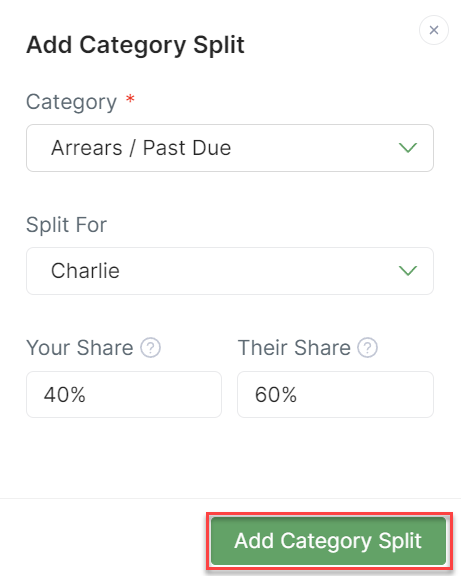 3. Select the category from the drop-down menu, who this split is for, and the percentage of each share. Once ready, click on Add Category Split.