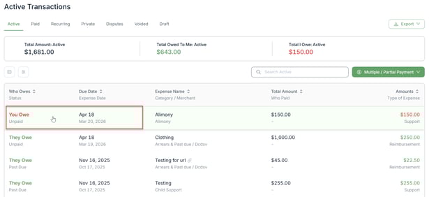 Once you follow these steps, the expense will be deleted. Please note that you can ONLY delete expenses that you created, and you can do this with any kind of expense (reimbursement, bill, support, recurring, etc.)