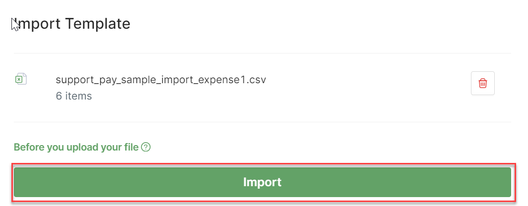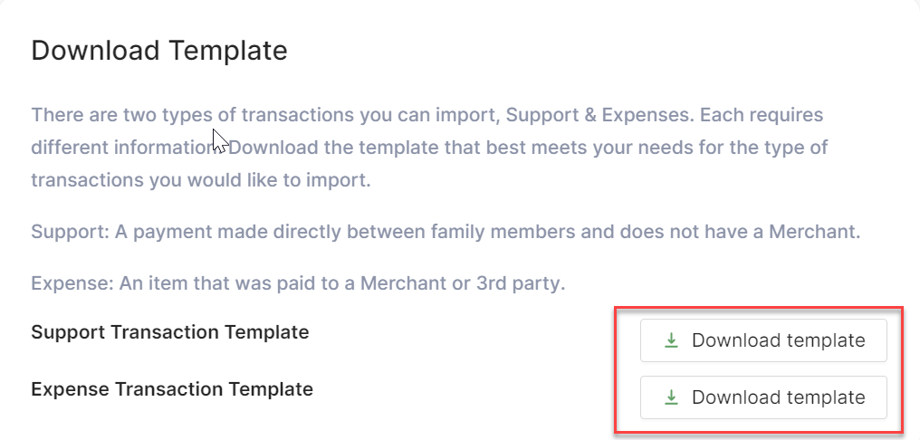 2. Download the CSV template by clicking the Download Template button and saving it on your device. Note: Choose between an expense or support template based on your import needs.