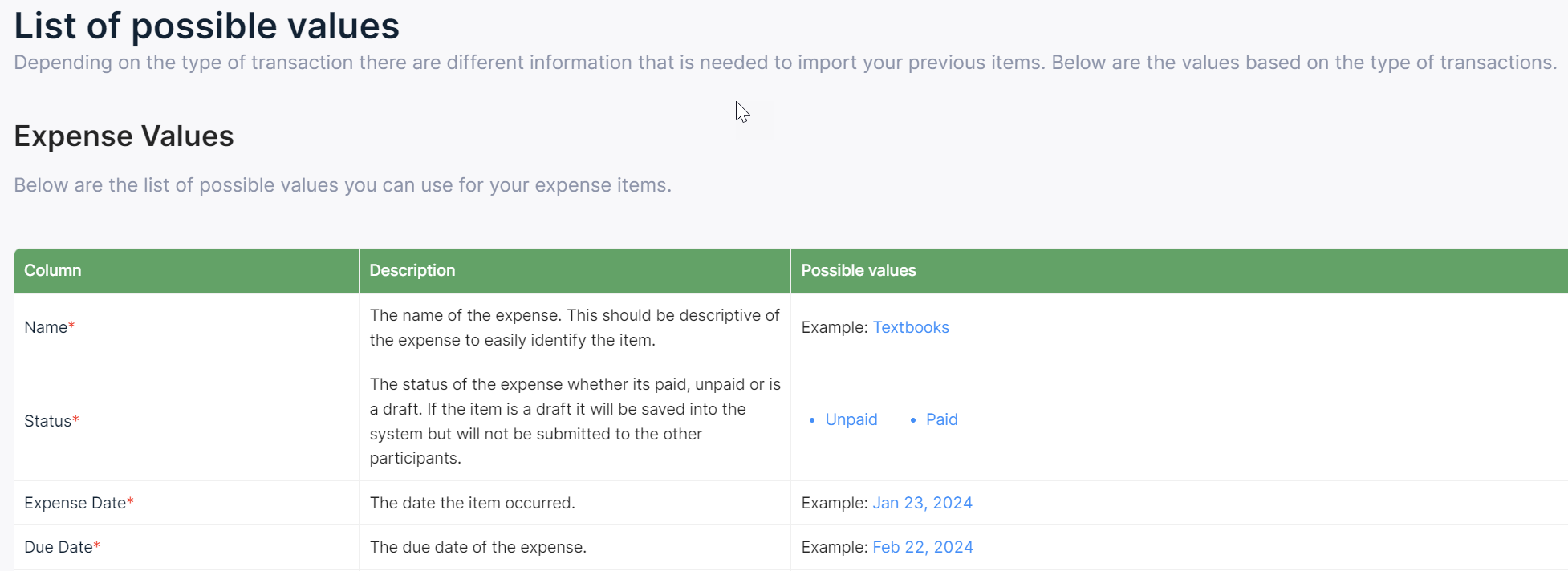 3. Open the CSV file, input your expense values (refer to the List Of Possible Values for guidance), and save the changes.