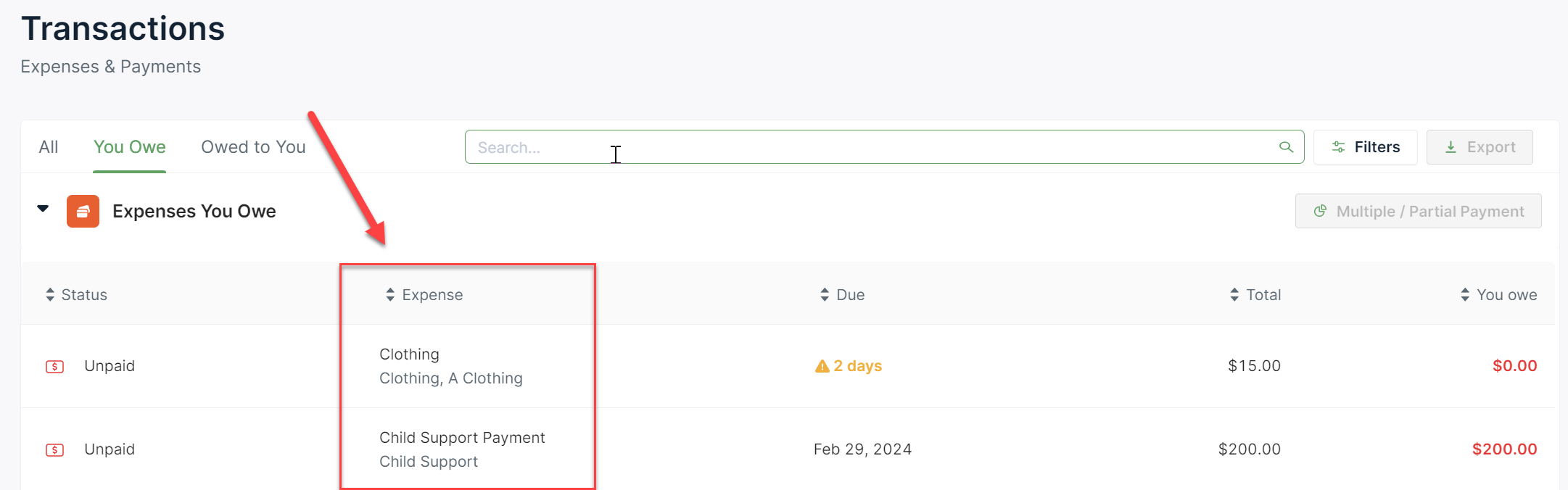2. Once you are in the You Owe section, choose the specific expense you wish to settle.