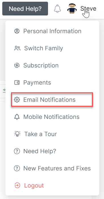 1. Click on your name at the top right-hand corner of the page and select email notifications.