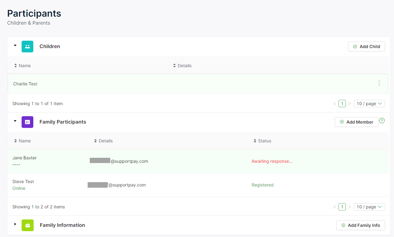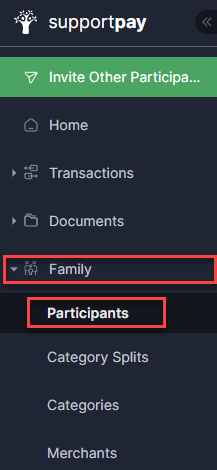 You can easily view and manage family members in your SupportPay account from the Participants screen. To get there, click on the Family tab on the left-hand side menu and select Participants, as shown in the image below: