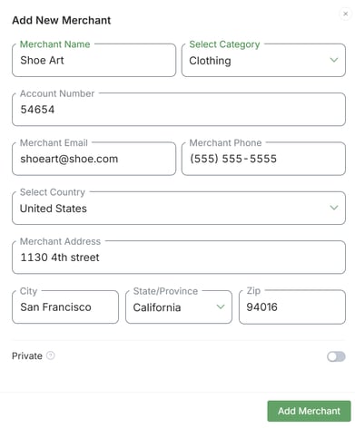 3. Enter the merchant details. In this step, only the name and category are mandatory fields. Still, you can add other details, such as the merchant's email address, phone number, and address. You can also specify if this is a private merchant. Once ready, click on Add Merchant.