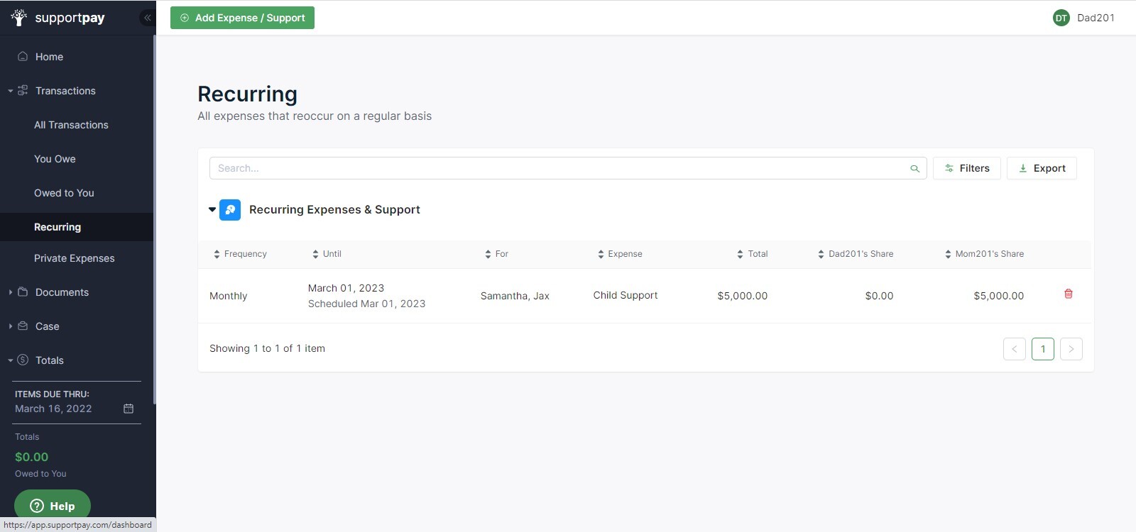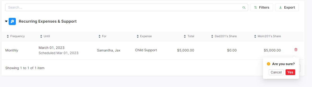 2. Once you are on this page, you will see a list of all the Recurring expenses you have entered. On the right-hand side of each Recurring Transaction, you will see a red trash can. Click it to delete each Recurring Transaction that you would like to remove.
