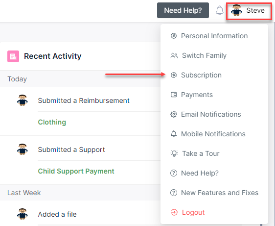 1. Click on your name at the top right-hand corner and select Subscription.