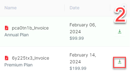 Click on the Invoice button and hit the download icon next to the invoice you want to download.