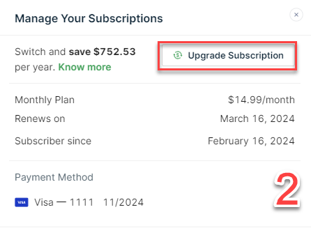 1) Click on the Manage button. 2) Click on the Upgrade Subscription button. 3) Select your new plan and payment method. Once ready, click on Subscribe.