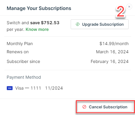 1) Click on the Manage button. 2) Select Cancel Subscription. 3) Let us know why you're canceling your subscription by selecting an option from the list. Once ready, click on Continue. 4) Click on the red Cancel Subscription button to confirm.