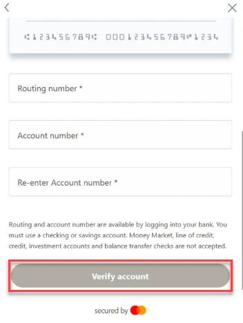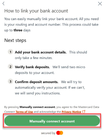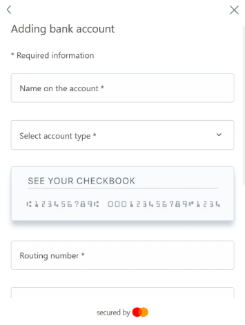 If you can't find your bank or prefer to use your routing and account number to register for bank transfers, you can manually register your bank account by following the instructions below:
