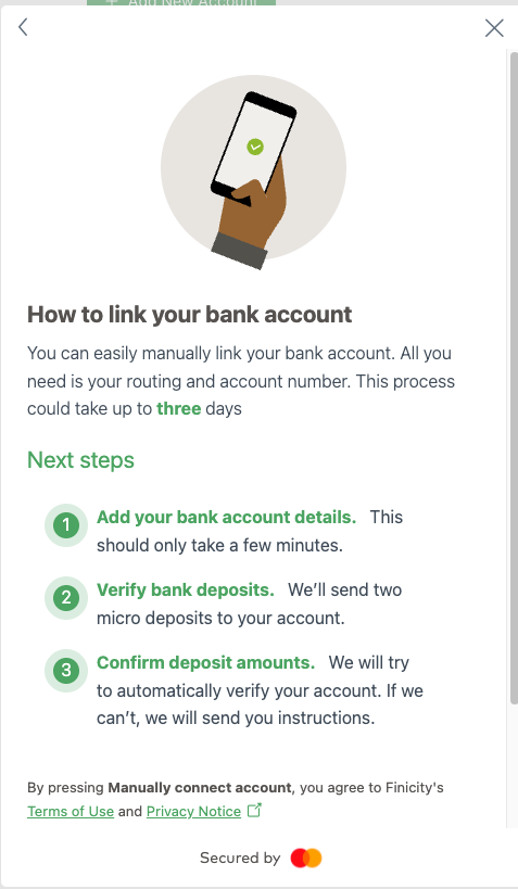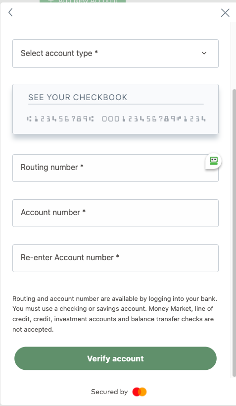 If you cannot find your bank or prefer to use your routing and account number, you can manually register your bank account by selecting "Add account manually" during the setup process. Simply enter your routing number and account number when prompted. Please note that manual verification may take 3 to 5 business days to complete. Refer to the provided screenshots for visual guidance through each step.