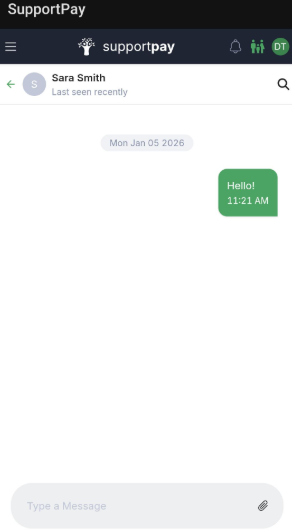 Start chatting and enjoy staying connected right inside SupportPay! Tip: You can also attach files to your messages, by clicking on the clip icon in the text box.