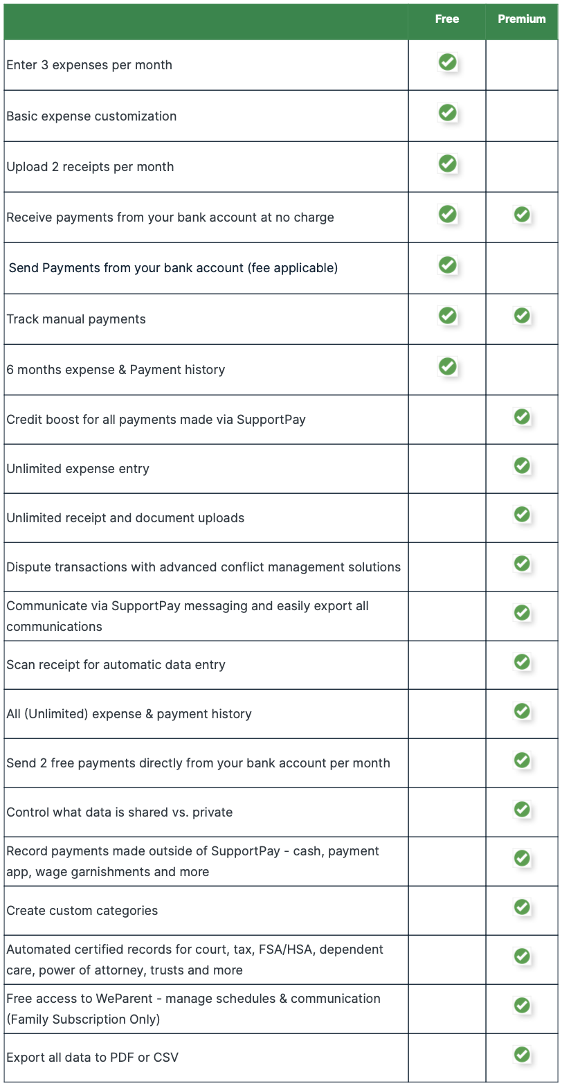 Below is a side-by-side overview of SupportPay Free vs. Premium features to help you see how upgrading can make managing support and shared expenses easier: